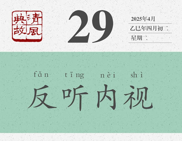 后人將“反聽之謂聰,內(nèi)視之謂明”縮減為“反聽內(nèi)視”四個(gè)字,并以此為典提醒人們,對(duì)外要虛心聽取別人的批評(píng)意見,對(duì)內(nèi)要及時(shí)反省自己的所作所為。《后漢書·王允傳》:“夫內(nèi)視反聽,則忠臣竭誠;寬賢矜能,則義士厲節(jié)。”