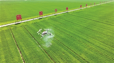 近年來,江蘇省宿遷市宿豫區(qū)多措并舉推動耕地保護(hù)責(zé)任落實,加快現(xiàn)代農(nóng)業(yè)產(chǎn)業(yè)園核心區(qū)建設(shè),保障糧食穩(wěn)產(chǎn)增產(chǎn)。圖為近日,在該區(qū)新莊小麥單產(chǎn)提升示范區(qū),無人機正在進(jìn)行植保噴灑作業(yè)。朱冠軍 攝