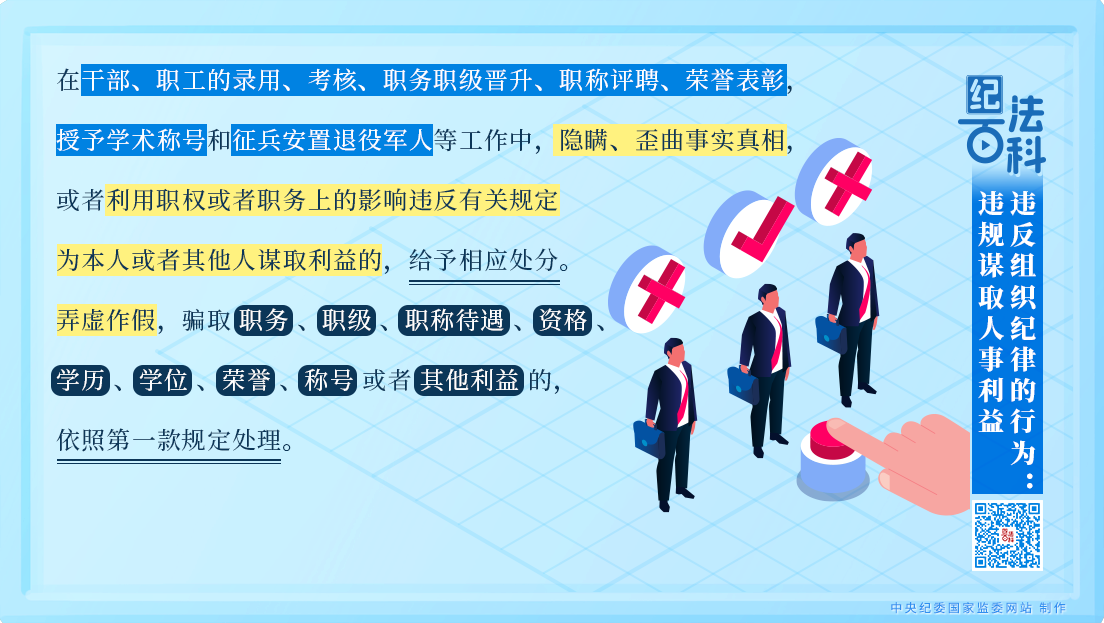 第一款規(guī)定,在干部、職工的錄用、考核、職務(wù)職級晉升、職稱評聘、榮譽(yù)表彰,授予學(xué)術(shù)稱號和征兵安置退役軍人等工作中,隱瞞、歪曲事實(shí)真相,或者利用職權(quán)或者職務(wù)上的影響違反有關(guān)規(guī)定為本人或者其他人謀取利益的,給予相應(yīng)處分。