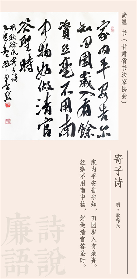 耿庭柏少年得志,20歲即中進士、任知縣,可謂春風得意。但耿徐氏卻并沒有一味沉溺于兒子帶來的榮耀,而是很冷靜、及時地寫了這首詩寄給他,給予諄諄告誡。詩句很平實,意思很明確,家中一切都好,田園的收入完全能夠養(yǎng)活家人。所以山陰(即今紹興)這個富庶之地的一絲一毫你都不可非法攫取來寄給我,只要你好好地做個清官來報答國家和黎民就足夠了。這首詩當時即傳誦一時,后來還被收入清代沈德潛編纂的《明詩別裁集》、宋弼編纂的《山左明詩鈔》等詩歌選集中。耿家為書香門第,科甲鼎盛,先后出過七個進士,但他們的詩詞作品都沒有流傳下來,反而是耿徐氏的這首詩為家族撐了門面。