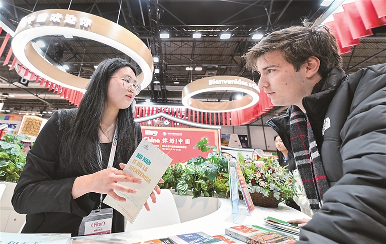 近年來,過境免簽政策持續(xù)擴(kuò)容、免稅購物政策不斷優(yōu)化、“即買即退”適用商店持續(xù)增加……得益于中國(guó)日益開放的舉措,越來越多外國(guó)游客在中國(guó)旅游、購物,感受更加開放包容、多元?jiǎng)?chuàng)新的中國(guó)。圖為1月21日至25日舉行的馬德里國(guó)際旅游展上,參觀者在中國(guó)展臺(tái)咨詢。新華社記者 程敏 攝