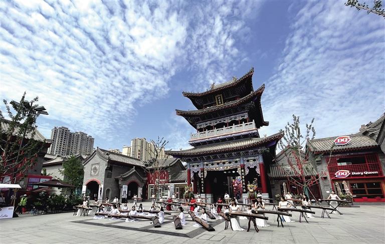 中國甘肅網(wǎng)6月28日訊 據(jù)蘭州日報報道(記者 李沛珂 攝)6月27日,由《蘭州日報》、西北民族大學(xué)、蘭州老街共同發(fā)起的“數(shù)箏齊奏頌黨恩”活動在蘭州老街舉行。來自西北民族大學(xué)音樂學(xué)院古箏專業(yè)“明·凈“箏團的40多位師生,齊奏《我的祖國》、《盛世國樂》、《唱支山歌給黨聽》等耳熟能詳?shù)慕?jīng)典曲目,吸引路過的市民紛紛駐足圍觀,贏得陣陣掌聲。