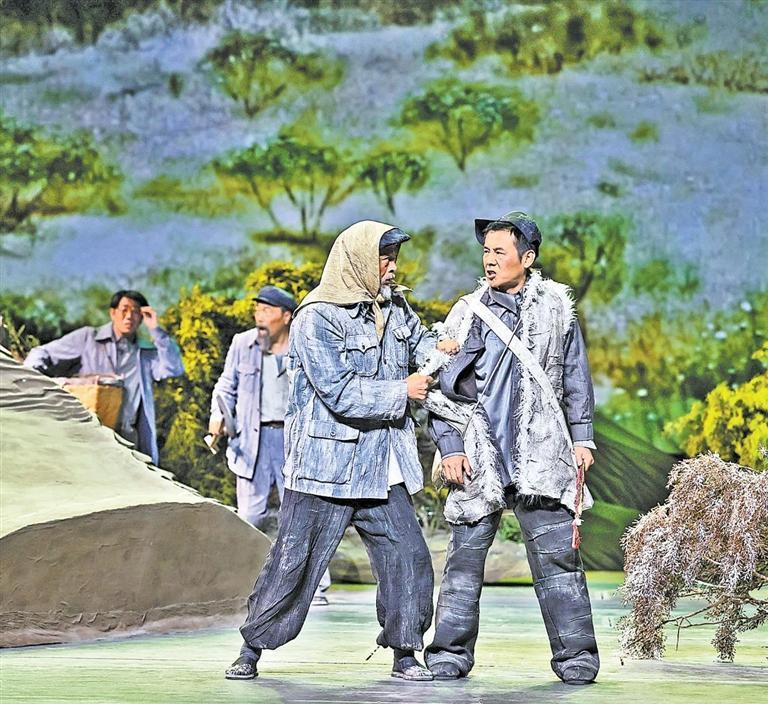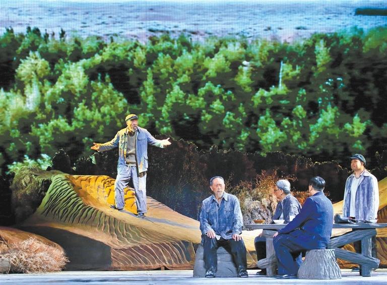 現(xiàn)實(shí)題材是話劇藝術(shù)的寵兒,在話劇進(jìn)入中國一百多年的時(shí)光中,現(xiàn)實(shí)題材創(chuàng)作占據(jù)相當(dāng)大的比例。在近當(dāng)代中國歷史的進(jìn)程中,話劇始終起著敢為天下先、針砭時(shí)弊的作用,但話劇又有其極其特殊的藝術(shù)框范。人們在觀看話劇時(shí),仿佛就是在觀看自己的人生,觀看自己和身邊最熟悉的人們,這是話劇藝術(shù)獨(dú)具的極高的審美要求。尤其是現(xiàn)代題材的創(chuàng)作,稍有不慎便會陷入同質(zhì)化的僵硬模式,使舞臺藝術(shù)失去應(yīng)有的美感。話劇《八步沙》讓6個(gè)老漢成為舞臺聚光燈下的主角,體現(xiàn)了創(chuàng)作者們呼應(yīng)時(shí)代之需,為最普通的農(nóng)民寫生立傳的拳拳之心。6個(gè)老農(nóng)民談不上人們通常意識中的“美”,“治沙”這樣的故事也相對比較單調(diào),不大容易出彩,而創(chuàng)作者們以八步沙這個(gè)真實(shí)的地名作為劇名,以“六老漢”治沙這個(gè)真實(shí)的事件作為全劇的敘述內(nèi)容,卻能宕開一筆把特定的外部環(huán)境與人物的內(nèi)心世界巧妙地融為一體,為全劇注入了濃郁飽滿的戲劇情境和情感,使這部話劇有了獨(dú)屬于自己的一份力度、一份無法替代的光彩。全劇的情節(jié)一曲三折,以小見大,當(dāng)黑壓壓的沙塵暴鋪天而來的時(shí)候,當(dāng)六老漢在嚴(yán)酷的環(huán)境中吃盡苦頭,摸索出“一棵樹,一把草,壓住沙子防風(fēng)掏”的寶貴經(jīng)驗(yàn),使漫無邊際的沙漠終于出現(xiàn)一抹綠色,繼而眼看著一棵又一棵綠樹成活成林,終于成為一片綠洲的時(shí)候,我相信觀眾的心也被藝術(shù)琴弦撥動,始終被劇情牽著走,為劇中人物的命運(yùn)擔(dān)心、懸心、痛心、開心,從中深深地感受到劇中所蘊(yùn)藏的豐富內(nèi)涵和它所傳達(dá)出的真切意趣。