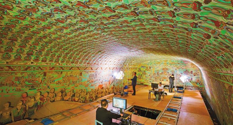 莫高窟第148窟數(shù)字化采集工作現(xiàn)場。敦煌研究院在國內(nèi)率先進(jìn)行文物數(shù)字化的探索研究,形成了一套科學(xué)的壁畫彩塑數(shù)字化技術(shù),制定了14項(xiàng)文物數(shù)字化保護(hù)技術(shù)標(biāo)準(zhǔn)與規(guī)范。