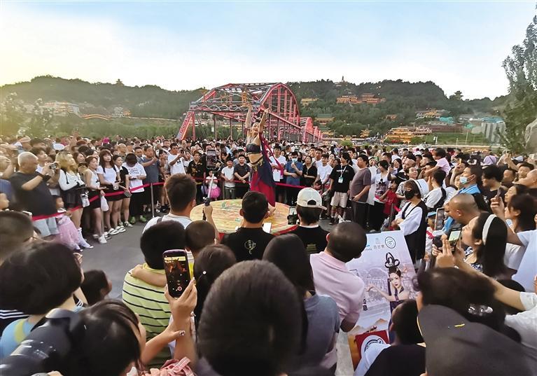圖為中山橋前的敦煌舞表演引游客圍觀。