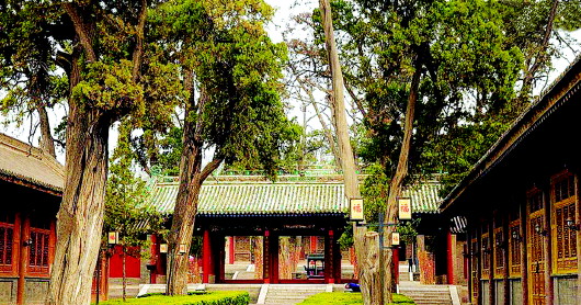由于山區(qū)祭祀不便,明成化十九年,地方官員向明朝廷申請在秦州專立伏羲廟,于是伏羲祭祀中心從卦臺山移至天水西關(guān)伏羲廟。伏羲廟有確切記載的年代是元代的三皇廟。三皇廟時,規(guī)模較小,沒有塑像,伏羲廟也正是在三皇廟的基礎上創(chuàng)建而成。根據(jù)史料,宋、金、元對三皇陵寢祭祀相當重視。廟里多株七八百年,乃至上千年的古樹也是那時所植,這些有靈性的古老的生命,見證了無數(shù)久遠而輝煌的歷史。