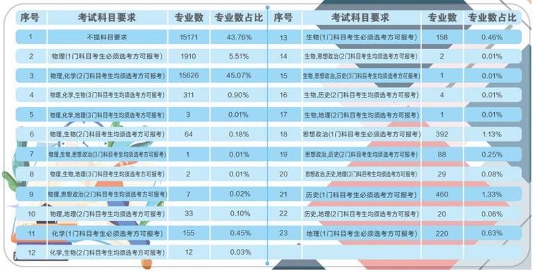 據了解,根據《甘肅省深化高等學校考試招生綜合改革實施方案》要求,從 2021年秋季入學的普通高中一年級學生開始,實行基于統(tǒng)一高考和高中學業(yè)水平考試成績、參考綜合素質評價的高??荚囌猩J健5?024年,基本形成分類考試、綜合評價、多元錄取的高??荚囌猩贫?,健全促進公平、科學選才、監(jiān)督有力的高??荚囌猩w制機制。此次在我省報送選考科目要求的高校專業(yè)共計64092條,其中本科專業(yè)34670條。專業(yè)選考科目要求共有23種組合,其中不提科目要求的本科專業(yè)數量占本科專業(yè)總數的43.76%,含物理科目的占比為51.79%,含化學科目的占比為46.46%,含歷史科目的占比為1.74%,含“物理+化學”科目的占比為45.98%。