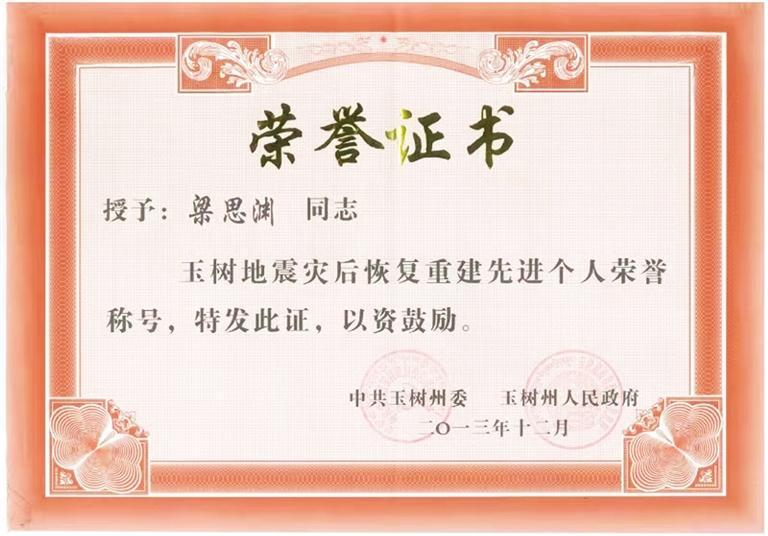 他一直這樣嚴(yán)于要求自己。因在格薩爾王賓館地震遺址維修保護(hù)項(xiàng)目中作出突出貢獻(xiàn),梁思淵被玉樹州委、州政府評(píng)為“玉樹地震災(zāi)后恢復(fù)重建先進(jìn)個(gè)人”。疫情期間,他主動(dòng)請(qǐng)纓,參與雁南路街道防疫物資運(yùn)輸保障任務(wù),轉(zhuǎn)運(yùn)物資總計(jì)150多趟次。