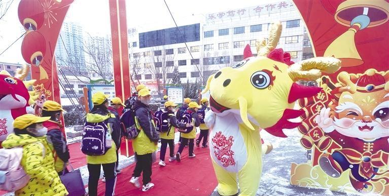 當日上午7時許,記者在蘭州市東郊學??吹剑iT內(nèi)兩邊擺放著兩條由數(shù)百個氣球組成的長龍。高年級段和低年級段的學生要穿越寫著“龍騰虎躍,前程似錦”的龍門,方可進入教室。同時,兩邊的老師,給每一位到校的學生發(fā)放小禮物。記者注意到,每個孩子都領(lǐng)到了一個小盲盒,里面裝著不同的文具。孩子們高興地揮舞著手中的盲盒,展示新春的快樂。