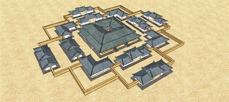 在中心夯土臺基四邊外約6.3米處平行分布有長方形附屬建筑,四角分布有曲尺形附屬建筑,對應位置的附屬建筑結構完全相同。長方形附屬建筑周圍有鵝卵石鋪就的散水環(huán)繞,其內(nèi)有兩個相對的方形土臺,邊緣有柱洞,土臺外端中部連接夯土矮墻延伸至曲尺形建筑。四角曲尺形附屬建筑周圍亦有散水環(huán)繞,臺基邊緣有柱洞,曲尺形六邊各有一級空心磚踏步。臺基上有若干規(guī)律分布的扁平狀青石,推測應為室內(nèi)立柱的礎石。曲尺形建筑的功能應該是連接兩邊的長方形建筑,同時還要兼顧外圍次一級附屬建筑的連接。各建筑散水周圍均鋪設回紋地磚,各臺基周邊散落著瓦礫堆積。