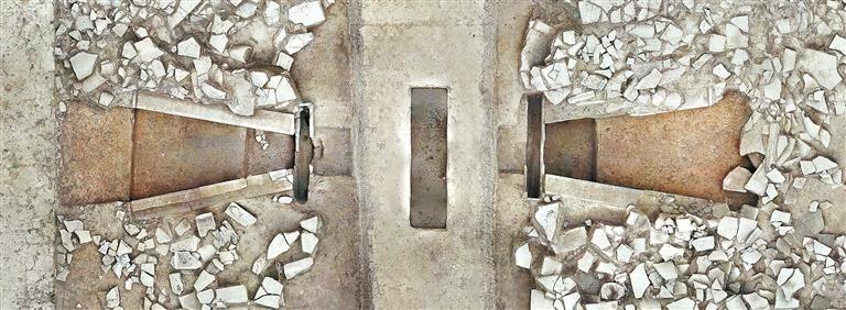 在考古發(fā)現(xiàn)中,我們注意到地磚磚縫采用了高超的填縫技術,形成了密封的地面,地磚鋪設有一定坡度,使得半地穴內(nèi)地面由四邊到中部形成約0.1米的落差。地面上各處疊壓多件檐頭筒瓦和瓦當,由此可證明此半地穴空間上方露天,沒有屋檐,應為建筑中心天井。H1北壁有一節(jié)被破壞的陶水管接口,經(jīng)解剖發(fā)現(xiàn)該陶水管向北穿過夯土高臺,在其北部散水處將半地穴天井中的落水排出。半地穴空間的四壁殘留上下兩排整齊排列的鐵釘,橫向釘在夯土壁上,應為固定壁磚之用,殘存壁磚邊緣可見填縫材料,經(jīng)檢測填縫劑為生石灰混合少量石英砂顆粒的無機質(zhì)材料,類似今天的“水泥”。