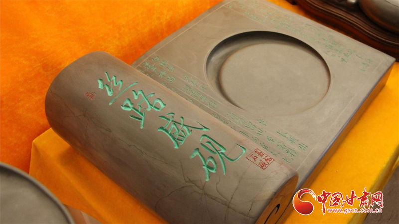 嘉峪石硯,取材于嘉峪山后的黑山峽深處,故又稱“黑山石硯”,是目前所知最早的古石硯之一。這種石硯質(zhì)堅而細(xì)、扣之有聲,發(fā)墨快而不損毫,儲墨久而不干,“有史記載的三百多種石硯中,只有嘉峪石硯是帶有銘文出土的。這對于石硯的研究具有重要的史料價值。”劉宗學(xué)向?qū)嵺`團(tuán)成員系統(tǒng)地講述了嘉峪石硯的傳承歷史,并展示了自己以絲綢之路為主題創(chuàng)作的“絲路盛硯”組合石硯。這套石硯主要以甘肅十四個地州市的建筑、景觀、歷史人物為內(nèi)容,體現(xiàn)了甘肅省的根脈文化、黃河文化、長城文化、絲路文化、紅色文化等五大文化,表現(xiàn)出甘肅在絲綢之路經(jīng)濟(jì)發(fā)展與文化交流中的重要作用。