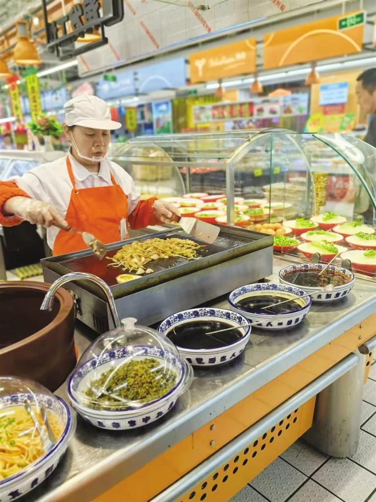 超市里的“平價(jià)食堂”,成為打造一刻鐘便民生活圈的重要載體。“超市周邊的居民、上班族、學(xué)生、酒店差旅客群的基礎(chǔ)比較大,所以增加快餐、堂食也是超市的一項(xiàng)便民舉措。”超市里升騰起的煙火氣,也讓超市的來客率明顯提升,“周末時(shí),油條的銷量能達(dá)到1000根、豆腐腦能賣到500碗,不管是檔口、自助收銀機(jī)都有排隊(duì)的顧客。”