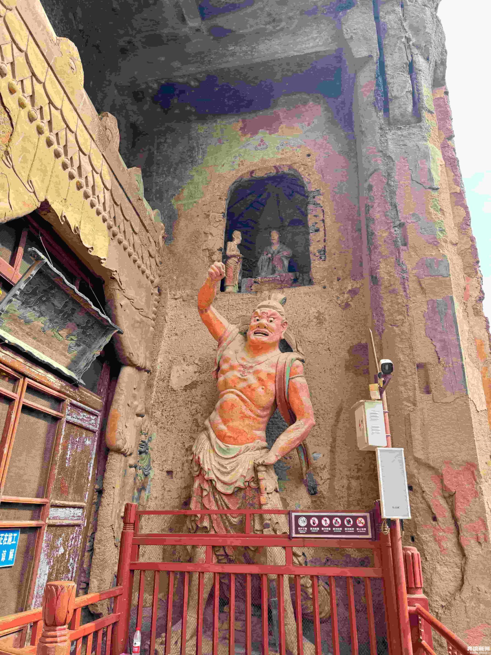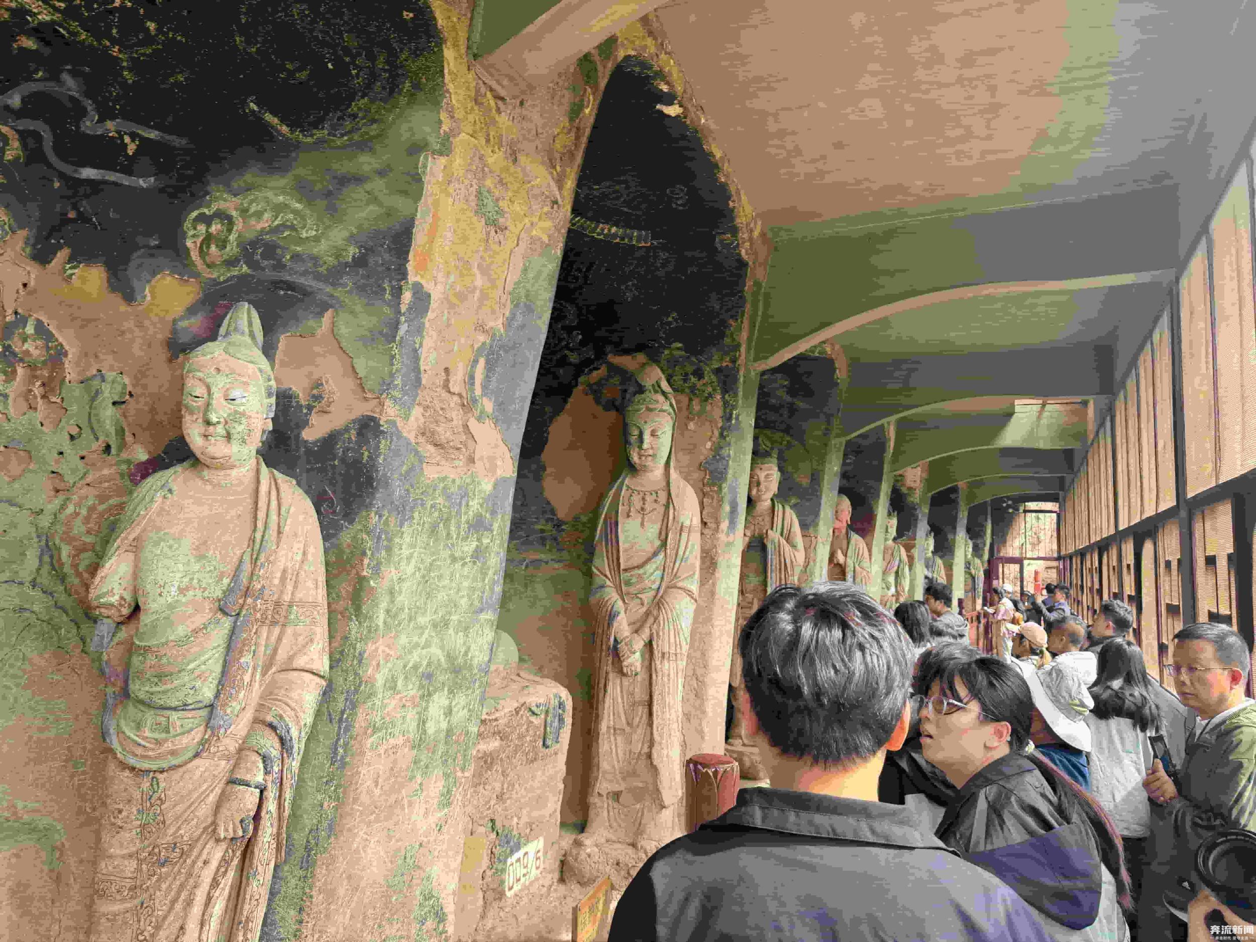 窟內(nèi)佛像造型各異,色彩鮮艷,既有莊嚴(yán)肅穆的佛祖、菩薩,也有生動活潑的弟子、天王。這些造像中,雖然有石雕和個(gè)別的木雕,但主要以泥塑為主,體現(xiàn)了多朝代中國佛教泥塑造像藝術(shù)的發(fā)展演變規(guī)律。奔流新聞記者了解到,在技法上,工匠們運(yùn)用了圓雕、浮雕、鏤雕等多種技藝,使得佛像栩栩如生,富有強(qiáng)烈的立體感和動感。麥積山石窟也因?yàn)槠洫?dú)特的“東方微笑”與精美的泥塑藝術(shù)聞名于世,被譽(yù)為“東方雕塑陳列館”。