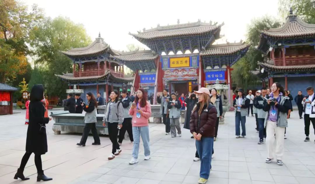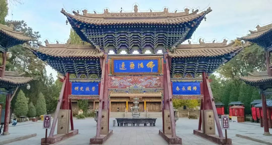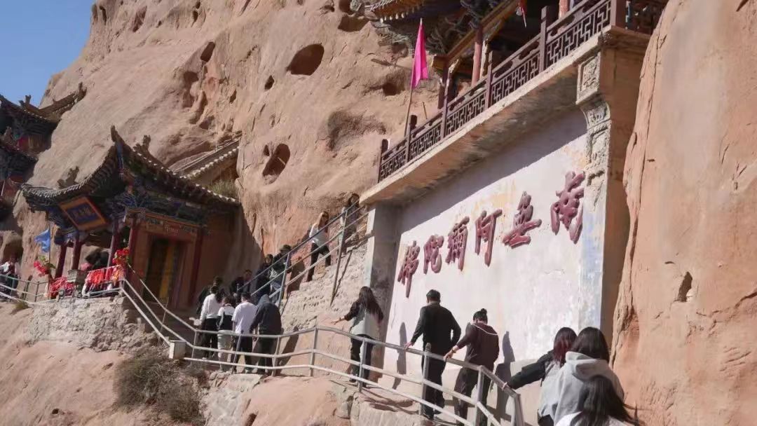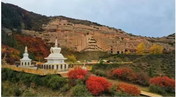 18日上午,迎著耀眼的晨光,采訪團成員乘坐大巴車來到了集自然風(fēng)光、石窟藝術(shù)、民族風(fēng)情、宗教文化于一體的肅南馬蹄寺。馬蹄寺是河西走廊著名的佛教勝地,石窟群開鑿于十六國北涼時期,距今約1600年的歷史,是絲綢之路上至關(guān)重要的歷史文化瑰寶,也是我國早期石窟的杰出代表。秋日的馬蹄寺,秋高氣爽,景色宜人,遠遠看去,紅綠相間,層林盡染,大家行走在落葉飄零的山間小路上,對這座建在懸崖峭壁之上、將棧道鑲嵌在山體之內(nèi)的石窟充滿了好奇。