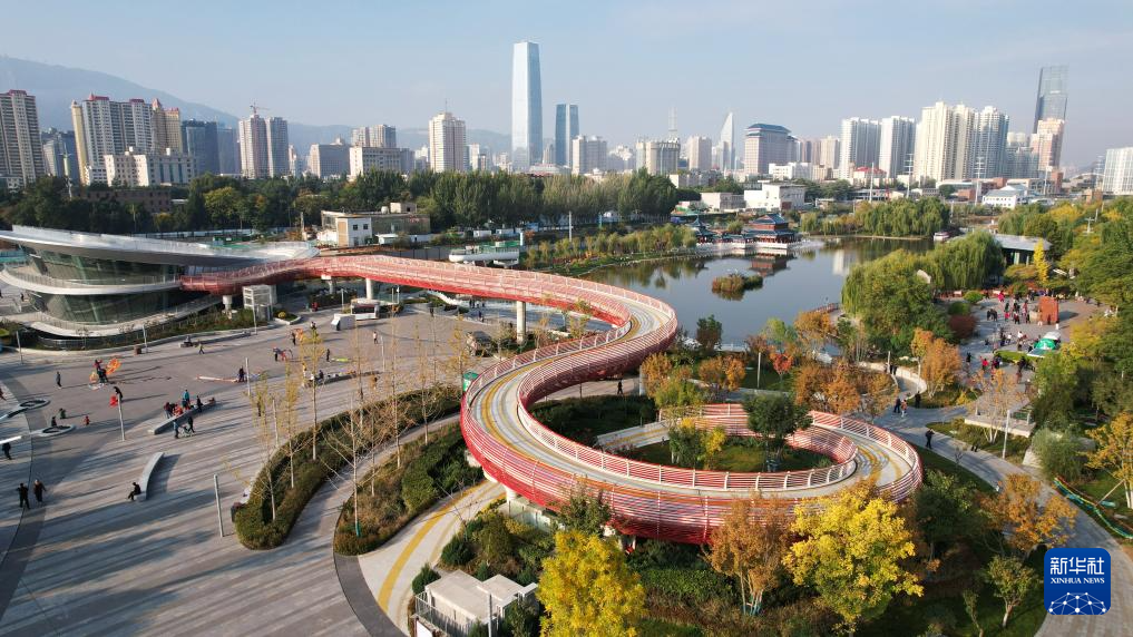 這是位于蘭州市城關(guān)區(qū)黃河北岸的馬拉松公園(10月17日攝,無人機照片)。新華社記者陳斌攝