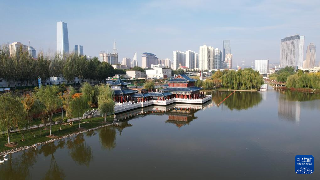 這是位于蘭州市城關(guān)區(qū)黃河岸邊的雁灘公園(10月17日攝,無人機照片)。新華社記者陳斌攝
