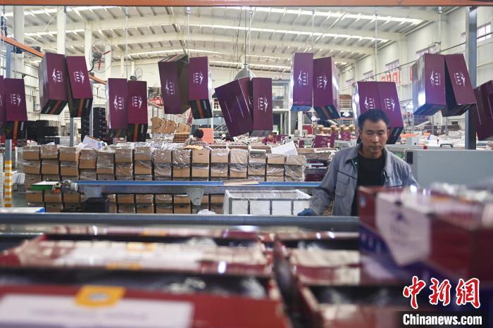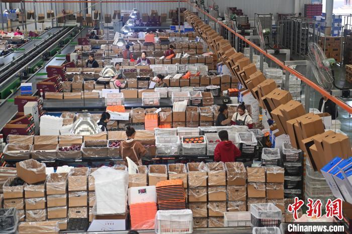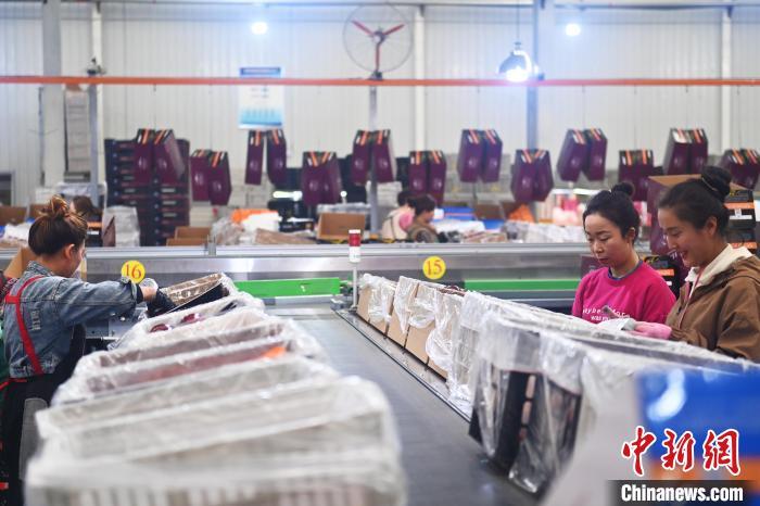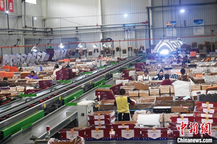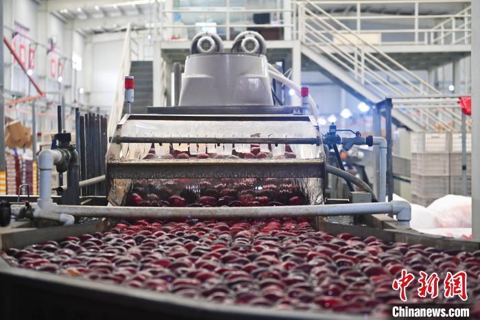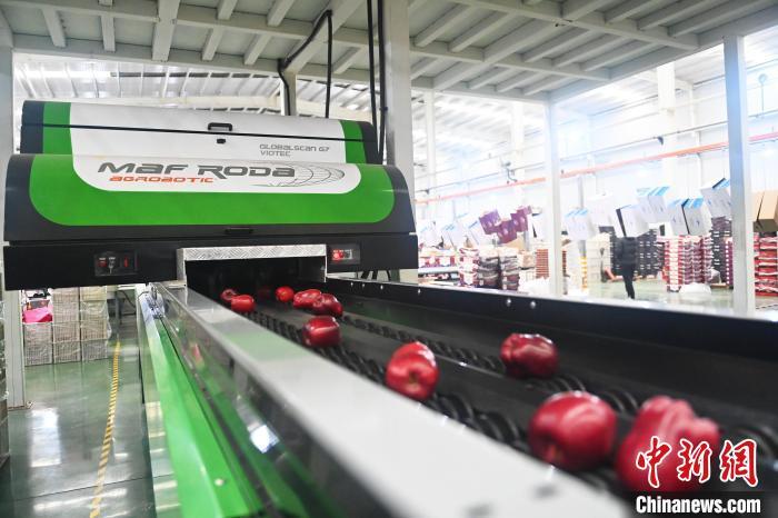 10月21日,在甘肅省天水市秦安縣雪原果品有限公司加工車間,蘋果自動化分揀線上工作人員進行分揀工作。該生產(chǎn)線每天能處理30噸蘋果,蘋果經(jīng)過設(shè)備水洗、烘干、稱重等環(huán)節(jié),進入不同等次的包裝線,工人們再對每顆蘋果進行復(fù)檢、貼標(biāo),分裝在不同規(guī)格的包裝箱中。甘肅秦安蘋果總面積61.37萬畝,產(chǎn)量86.8萬噸,產(chǎn)值55.6億元人民幣,先后從國內(nèi)科研院所引進青砧、M26、ZH5等抗重茬蘋果矮化砧木6個,配合國家蘋果產(chǎn)業(yè)技術(shù)體系,引進長富2號、煙富6號、煙富8號、瑞香紅等蘋果新品種12個。中新社記者李亞龍攝