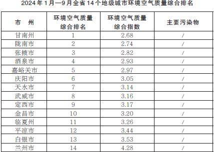 2024年1月—9月,全省14個(gè)地級(jí)城市環(huán)境空氣質(zhì)量綜合排名由高到低分別為:甘南州、隴南市、張掖市、酒泉市、嘉峪關(guān)市、慶陽(yáng)市、天水市、武威市、定西市、金昌市、臨夏州、平?jīng)鍪小足y市、蘭州市。