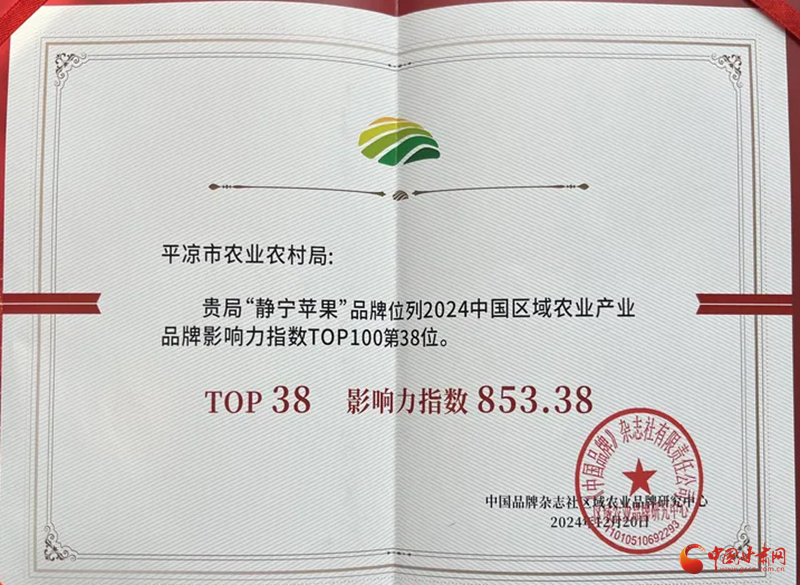 中國甘肅網(wǎng)12月25日訊(西北角·中國甘肅網(wǎng)記者 孫珩力 通訊員 胡繼萬)近日,由《中國品牌》雜志、中國品牌網(wǎng)主辦的2024區(qū)域農(nóng)業(yè)品牌年度盛典在浙江金華舉行。會上,“靜寧蘋果”品牌榮登2024中國區(qū)域農(nóng)業(yè)產(chǎn)業(yè)品牌影響力指數(shù)百強(qiáng)榜。