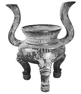 明崇禎三年韓王亶公式造銅鼎:鼎高1.01米,口徑0.493米。侈口斜沿,內(nèi)折窄唇,束頸,溜肩,“S”形對稱高耳,鼓腹,圜底,獸面吐舌形三高足,足跟缽形。頸上部飾凸弦紋四道,頸中部浮雕夔龍六條,雷紋襯地,頸下部飾三道凸弦紋,肩形二道凸弦紋。腹部鏨刻紀年、造者、監(jiān)造、工匠等銘文59字。
