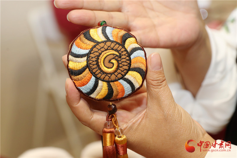 真正讓她想“給香包加點新東西”,是一次省博看展的觸動。站在馬家窯彩陶罐前,她盯著罐身流轉(zhuǎn)的旋渦紋出了神:“這么好看的紋路,繡在香包上多妙?”后來去敦煌,莫高窟里飛天的飄帶、藻井的繁復(fù)花紋更讓她挪不開腳。回來的路上,一個念頭愈發(fā)清晰:要讓博物館里的文物“活”在香包里,讓老手藝沾染上“文化氣”。