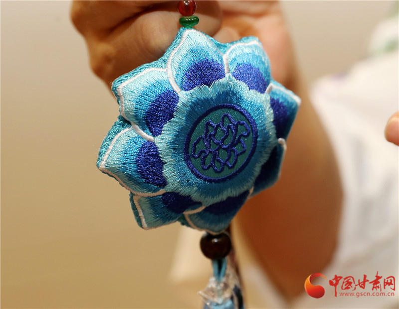 甘肅省博物館非遺集市的展臺前,包雨蕾的敦煌藻井香包一亮相就攥住了人的目光——青綠色絲線繞出的蓮瓣層層疊疊,中心飛天剪影隨腳步輕晃,清雅檀香混著花草香漫開來。這款光是飛天飄帶針法就琢磨了一個月的新作,藏著她的心思:用慶陽香包的針腳,把甘肅的千年文脈繡進(jìn)當(dāng)下生活。