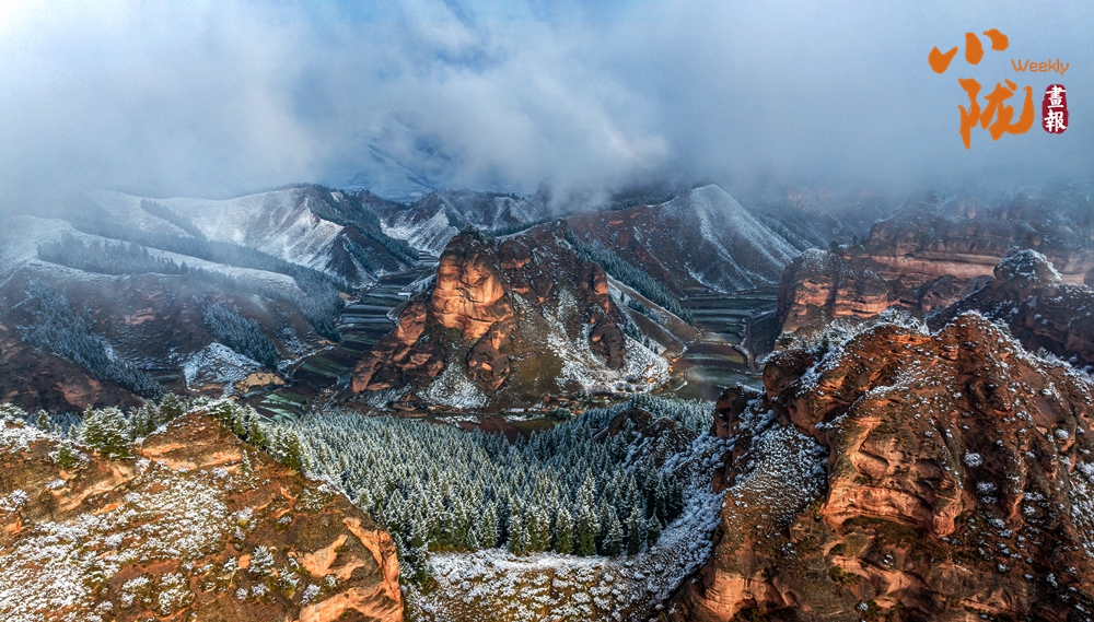 雪后天晴,煙波浩渺,山色空蒙,朱紅色的丹霞與蔥郁的森林、皚皚白雪相映成趣,展現(xiàn)出冬日里別樣的壯麗與靜謐。