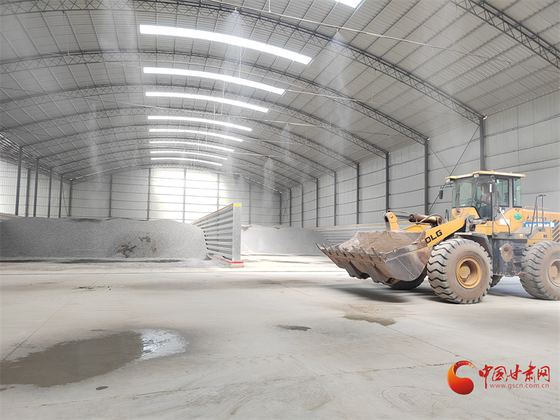 G30忠茅擴(kuò)容改造項目拌合站儲料車間,一輛輛工程車正在來往穿梭儲備物料。