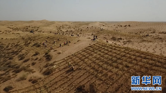 圖為甘肅省武威市古浪縣八步沙林場在扎草方格壓沙(資料圖片)。新華網發(fā)(童張偉 攝)