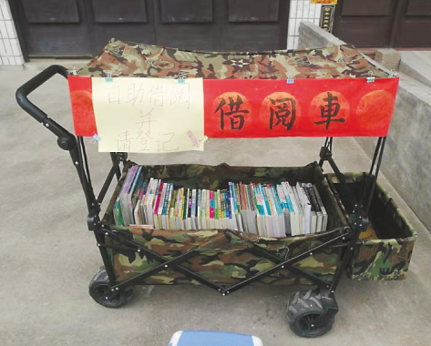 早上9點(diǎn)左右,自助借閱車從外婆家推出門,天黑了再推回來??吹较胱x的書,讀者自行登記書名和個人信息,留下聯(lián)系方式,就能把書借回家。