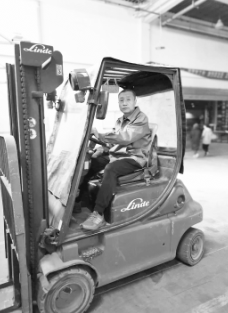 馬曉峰駕駛叉車(chē)搬運(yùn)圖書(shū)。