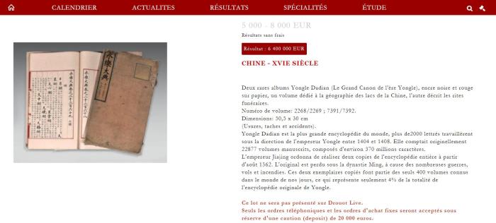 兩冊(cè)《永樂(lè)大典》以5000歐元起拍,叫價(jià)瞬間突破50萬(wàn)歐元,此后叫價(jià)如直升機(jī)一般上升,幾分鐘后價(jià)格飆升至500萬(wàn)歐元。