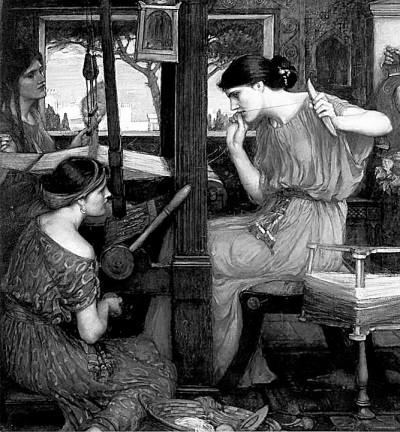 英國(guó)畫家約翰·威廉姆·沃特豪斯的作品《珀涅羅珀和她的追求者們》(局部)。資料圖片