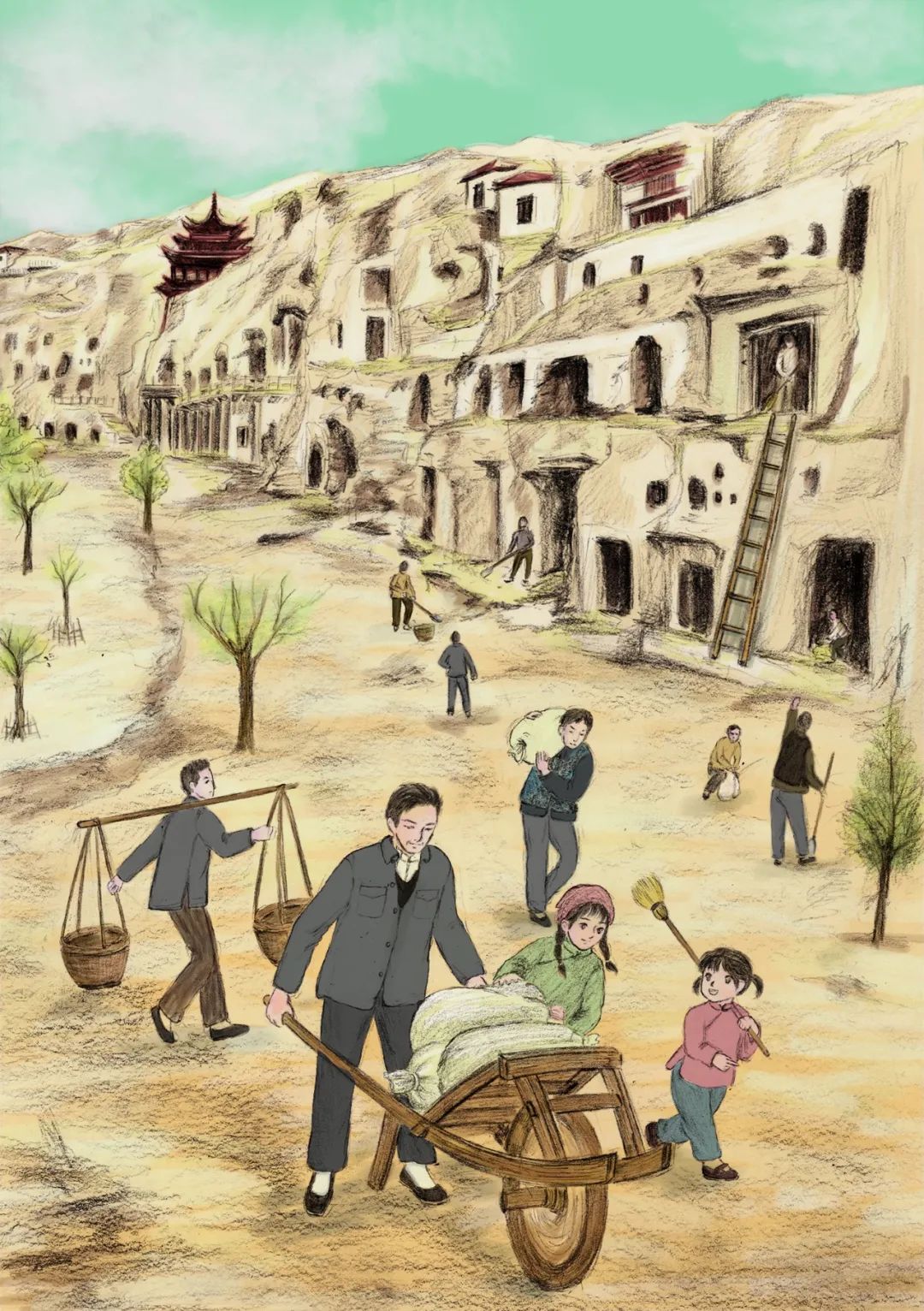 這也是一本有時代縱深感的書,它從欣潔失去媽媽的抗戰(zhàn)時期寫起,一直寫到中國人民解放軍接管敦煌。它寫欣潔一家坐著敞篷卡車,一路顛簸從成都來到敦煌,作品對沿途自然風(fēng)貌和人情民俗的多彩變化都有生動描寫。它寫欣潔一家在敦煌的小土屋里安家,既有時代地域特色又有家庭的溫馨和暖陽。它寫一個小女孩如何從對莫高窟的一無所知到逐漸認(rèn)知、理解再到熱愛的成長歷程,充分表現(xiàn)了敦煌人一開始就具有的積極上進(jìn)的理想和精神。同時作者也力圖通過這樣一個故事告訴我們,一個孩子是怎樣認(rèn)識并理解敦煌的。