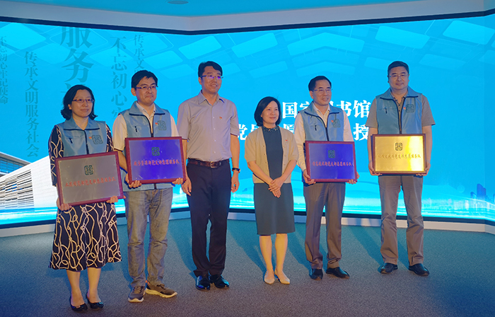 6月8日上午,國(guó)家圖書(shū)館新閱讀空間開(kāi)放暨黨員志愿服務(wù)總隊(duì)成立活動(dòng)在國(guó)家圖書(shū)館總館北區(qū)舉行?;顒?dòng)現(xiàn)場(chǎng),國(guó)家圖書(shū)館黨委書(shū)記、副館長(zhǎng)魏大威,國(guó)家圖書(shū)館副館長(zhǎng)、黨委副書(shū)記陳櫻為4支黨員志愿服務(wù)分隊(duì)代表授牌。