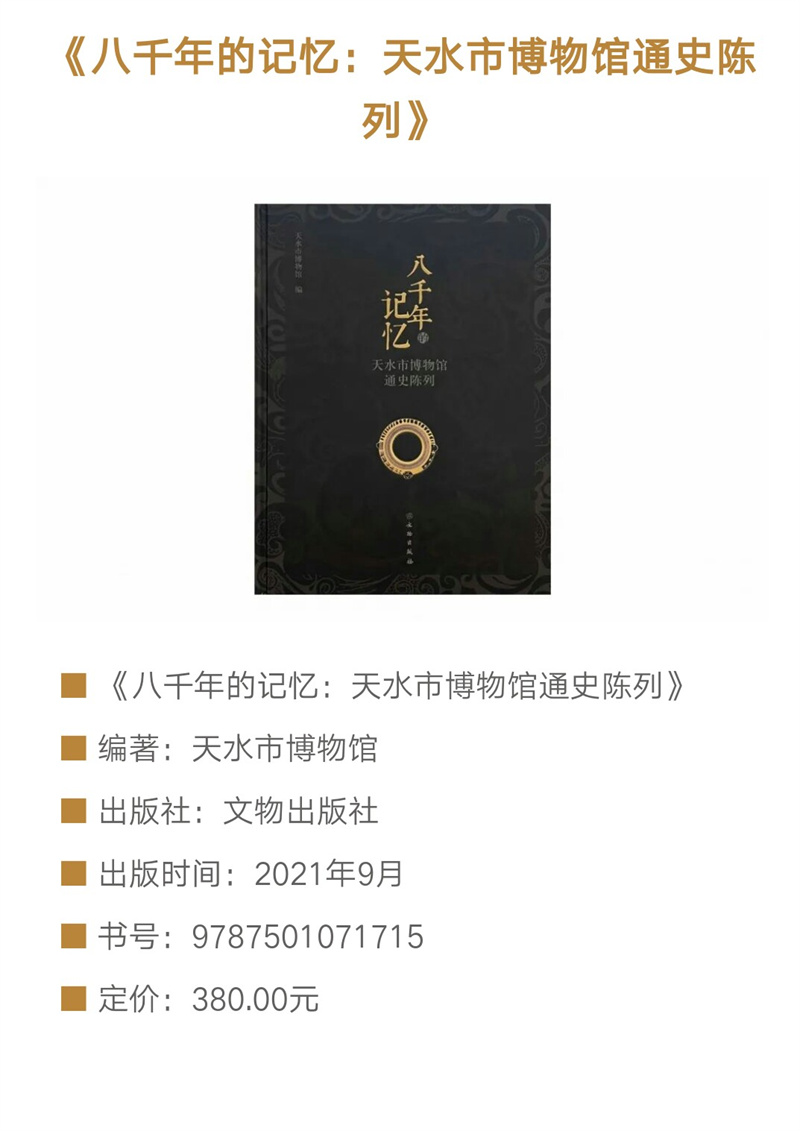 《八千年的記憶——天水市博物館通史陳列》圖錄,是在2018年天水市博物館通史陳列展覽提升改造基礎(chǔ)上提煉而成,以天水市博物館能夠反映天水歷史文化面貌的館藏精品文物為重點(diǎn),輔之以天水地區(qū)出土的藏于其他文物機(jī)構(gòu)的重點(diǎn)文物,旨在展示天水八千年歷史文脈和文明成就。全書共分為文明曙光、嬴秦故園、兩漢物華、魏蜀兵戈、渭水梵音、隋唐盛景、茶馬大市、古城遺韻8個部分,擷集天水文物精粹,在展現(xiàn)天水自舊石器時代至明清時期完整歷史序列的同時,突出了獨(dú)具天水特色的歷史文化資源。