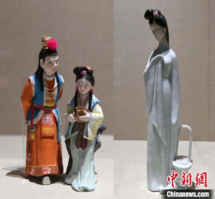 紅樓夢(mèng)題材泥塑《讀西廂》和瓷塑《黛玉葬花》。中新社發(fā) 許建梅 攝