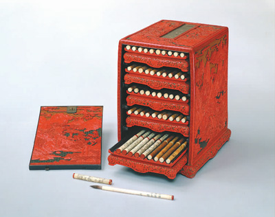 文房四寶與讀書人的關系十分密切。展廳里陳列的宮中文房用具非常精美,引得觀眾駐足細賞。一件飾有云山水岸圖案的紅漆筆匣,里面裝著50支毛筆,每支筆材質、裝飾、筆頭造型各不相同,筆管上分別題有乾隆在不同時期所撰詠花詩。