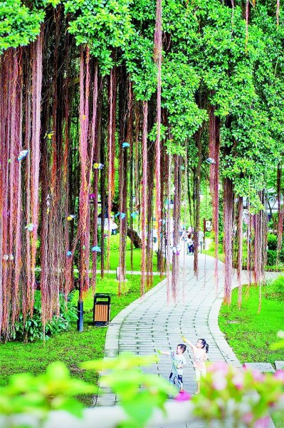 兩名兒童在福州市江心公園里的榕樹下玩耍。新華社發(fā)