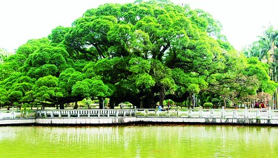 擁有古樹的城市就是擁有歷史的城市。福州古榕遍布,四季常青,是城市、市民生活與樹木的完美結(jié)合,是風景的自然生長,是歷史根深葉茂地屹立。福州古榕以樹齡長、歷史久、數(shù)量眾而著稱。見證福州城市史的,當首推鼓山國家森林公園、八一水庫旁,福州無人不知的已近千歲,被譽為福州榕樹王的古榕。相傳,這棵古榕是張伯玉所栽植的兩棵樹苖,光陰荏苒,同氣相求,如今兩棵榕樹相互糾結(jié)、勾連、纏繞、親密,已無分彼此。其冠幅達1300米,可容納千人在樹下談古論今,聊天遮陰。遠望,似綠色陵巖;近看,知其為榕也,密密的枝葉把近午的陽光切割成碎花點,散落、閃亮在榕樹下的草坪和地衣上。初訪者或為訝異:偌大一棵古榕卻不見氣根,知榕者會告訴你,這是一株碩大、古老而不生氣根的細葉榕。因其冠幅日益長大,為了支撐沉重的樹冠、預(yù)防主干折損,便制作了若干石柱,砥柱其間。古榕下有湖塘,錦鯉游泳,不時生出紅色漣漪。旁有一碑,上刻:榕蔭照水波心漾,觀魚猶勝花間行。