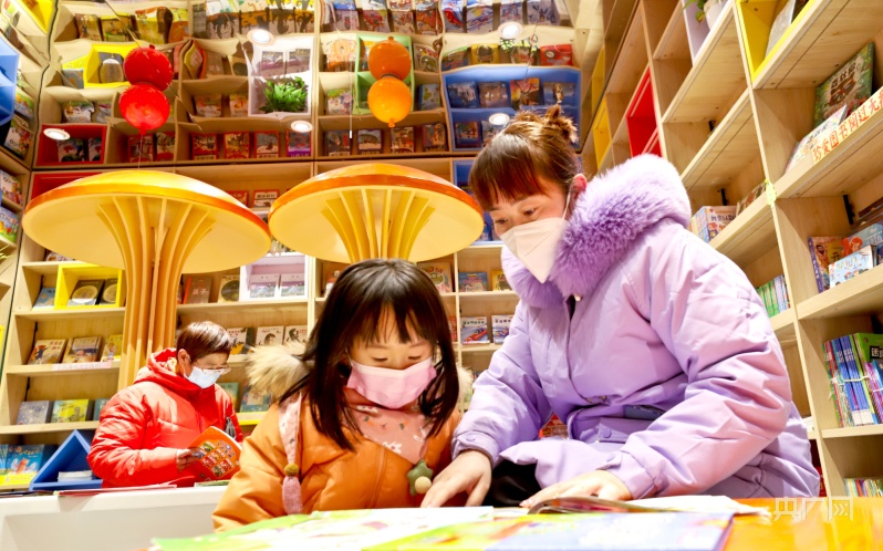 1月23日,一位母親帶著孩子在甘肅張掖錦華書城讀書。(央廣網(wǎng)發(fā) 王將 攝)