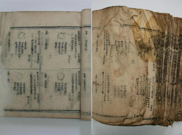 2021年,安徽省圖書館修復(fù)的徽州休寧《魚鱗圖冊(cè)》(明萬(wàn)歷木活字印本)修復(fù)前后對(duì)比圖。(安徽省圖書館供圖)