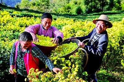 竹編背簍里裝滿豐收的菊花。楊威攝