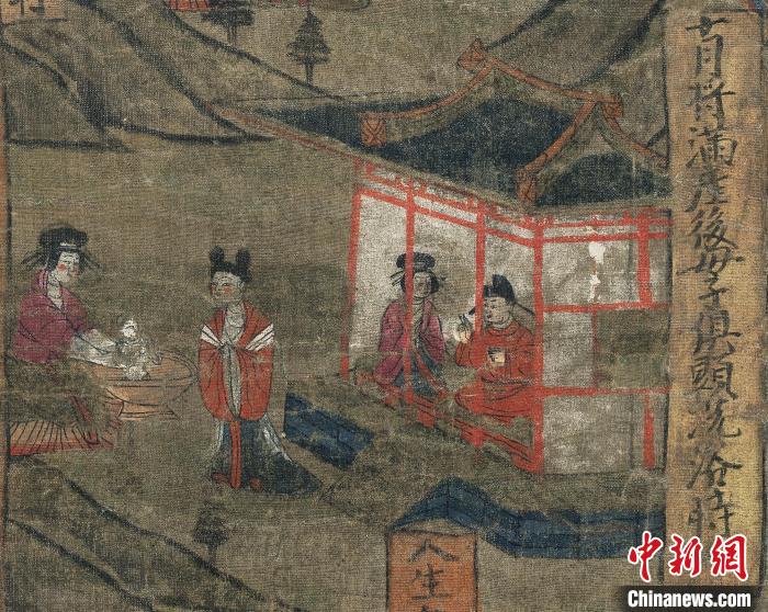 圖為“報(bào)父母恩重經(jīng)變絹畫(huà)”中的“十月將滿(mǎn),產(chǎn)后母子俱顯,洗浴時(shí)”的畫(huà)面。(資料圖)甘肅省博物館供圖