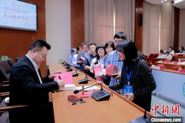圖為邱華棟向部分參會代表進行現場簽名贈書?!让晒艓煼洞髮W供圖