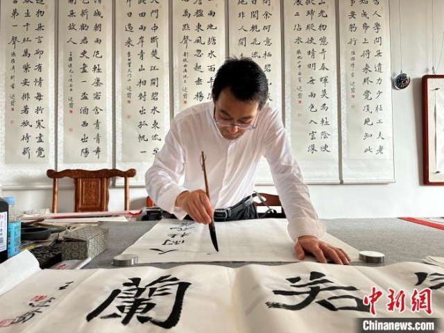 “我從小練習(xí)繪畫,從學(xué)校畢業(yè)后直接回縣里開了自己的書畫工作室,現(xiàn)在入駐悅心國(guó)際書畫村,收入還可以。最主要耐得住寂寞,靜下心來打磨技藝。”“90后”通渭本土?xí)嫾伊茉诋?dāng)?shù)匦∮忻麣?。他說,書畫在年輕群體當(dāng)中很受歡迎,尤其前來跟他學(xué)習(xí)的學(xué)生很多。