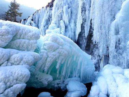 往前走,山和山之間的天顯得窄小了,抬頭,并沒有鷹飛過。懸崖峭壁上是一簾簾冰掛冰瀑,老天爺最寫意的畫作,是用白水晶,羊脂玉做成的。心里沸騰著歡喜,眼睛卻被這世界上最純凈的光芒刺出了淚,這凝固的千堆雪,這些白玉蘭,這些合歡樹,對(duì)嗎?不對(duì)。這些冰瀑,站在遠(yuǎn)處和近處看到的物像都不相同,正面和側(cè)面觀看,更是形態(tài)各異。