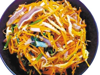 ● 做法:以地產(chǎn)蔬菜胡蘿卜、菠菜和綠豆芽,搭配耳絲、口條、肝片而成,色澤明快、微酸適口:胡蘿卜絲用少許鹽腌至脆柔、綠豆芽焯水保持白嫩、綠菠菜焯過捏去水分切成寸段,這三樣食材搭配營養(yǎng)成分暫且不說,單就紅、白、綠三色,就足夠醒目了。正宗的天水酒碟還要配以鹵豬耳、豬肝和煮熟的拆骨肉,最后點綴以綠綠的香草。
