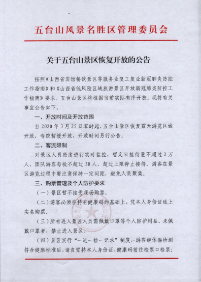五臺(tái)山風(fēng)景名勝區(qū)管理委員會(huì)對(duì)外宣布,自2020年3月25日零時(shí)起,山西五臺(tái)山風(fēng)景名勝區(qū)恢復(fù)露天游覽區(qū)域開放,寺院暫緩開放,開放時(shí)間另行公告。